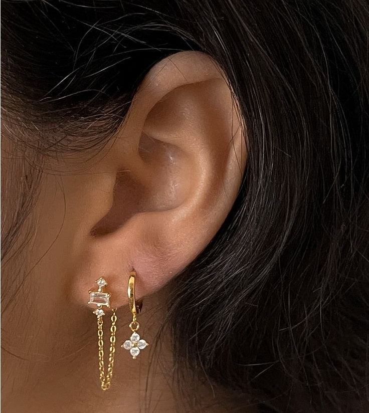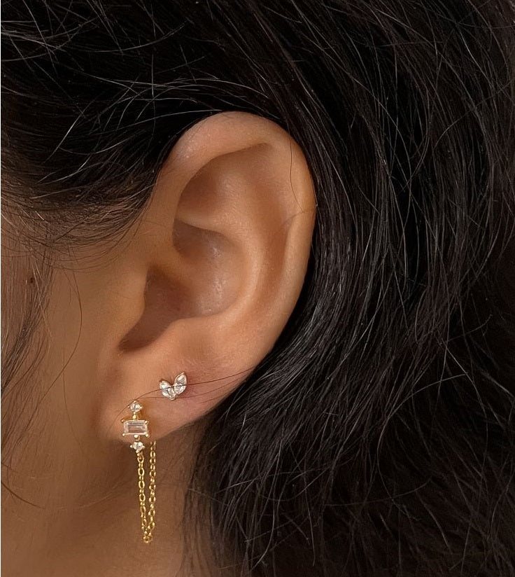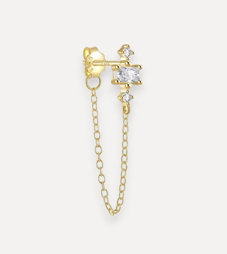 JUNE est une boucle dotée d'une fine chaine accrochée à un ensemble de zircons. Elle est associée ici au piercing DUET et à la boucle MINI MYA.